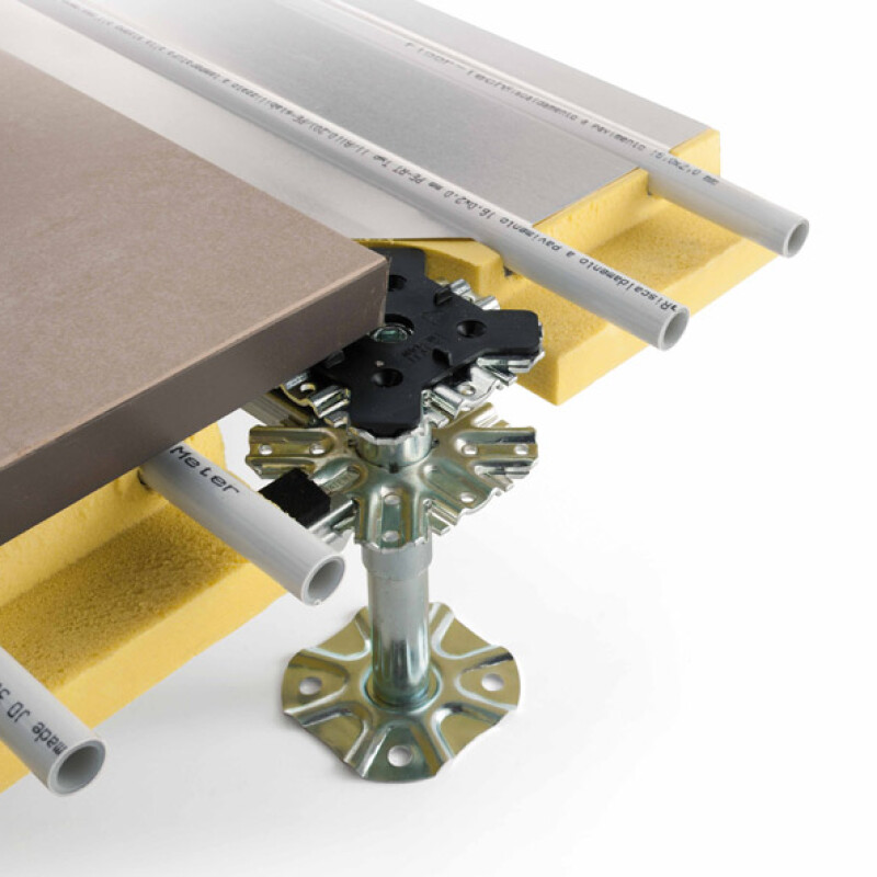 Il sistema è composto da pannelli modulari abbinati ad un sistema radiante che viene sopraelevato dalla soletta in calcestruzzo tramite una speciale struttura regolabile in altezza da 14 cm a 65 cm, al fine di creare un’intercapedine sotto pavimento per raccogliervi gli altri impianti di tipo elettrico, idraulico, telefonia o informatica.