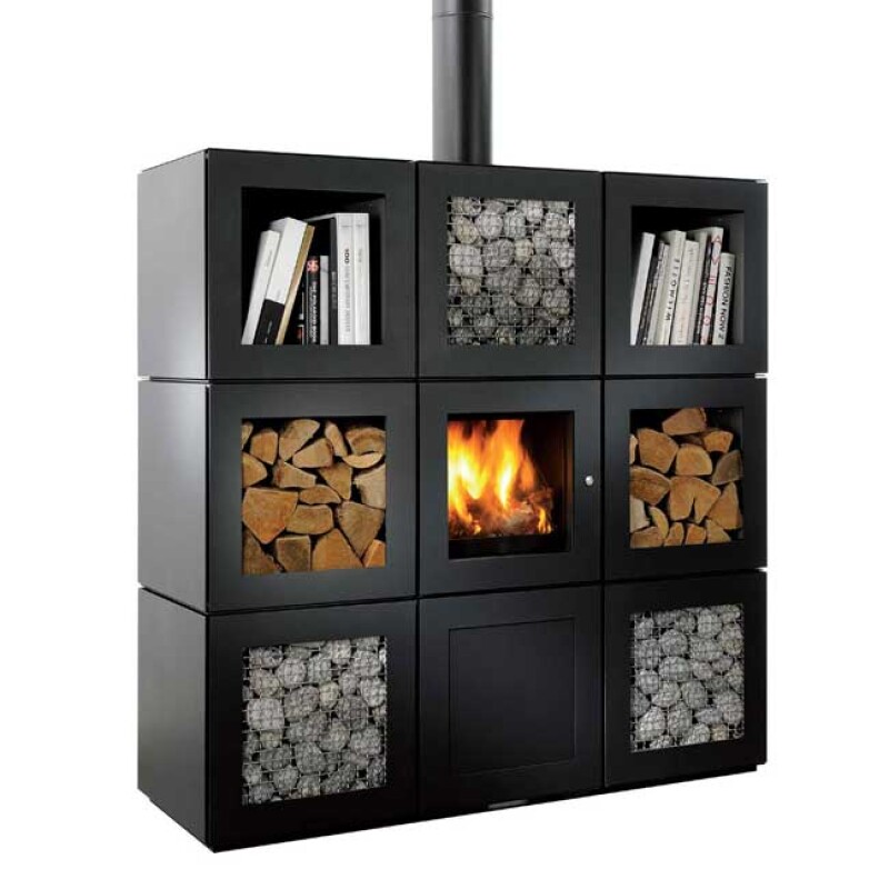 Oltre al focolare, la collezione è composta da 2 tipi di moduli cubici opzionali (50x50cm) chiamati «box» che combinati con la stufa a legna apportano funzioni specifiche e complementari.