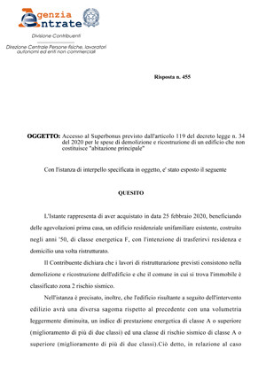 Rifacendosi poi ai contenuti della circolare 24/E del 2020, posto che l’istante sia in possesso dei requisiti necessari per la fruizione delle detrazioni, è confermata la possibilità di usufruire del Superbonus al 110% per interventi di demolizione e ricostruzione dell’edificio a prescindere che esso sia adibito ad abitazione principale, precondizione che non è più necessaria per questo incentivo.
