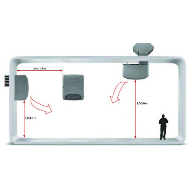 Un involucro in polipropilene espanso (verniciabile) ad alto potere isolante termoacustico alloggia due sezioni ventilanti: una per l’aria di rinnovo e l’altra per l’aria di espulsione. La portata d’aria è regolabile da 1200 a 150 m³/h.