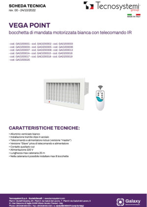 La bocchetta di mandata motorizzata Vega Point è realizzata in alluminio verniciato bianco e dotata di installazione tramite clips in acciaio.