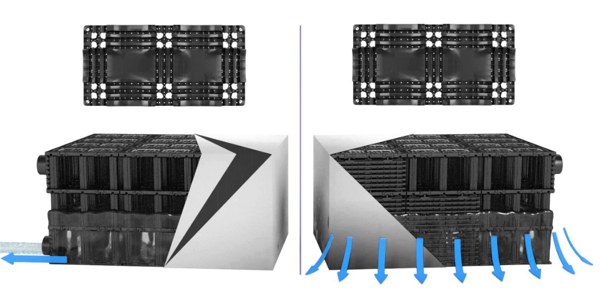 Il punto di forza di Q-Bic Plus LC è la sua straordinaria flessibilità progettuale. Grazie alla struttura modulare e all’intelligente sistema di collegamenti, è possibile configurare il serbatoio secondo le esigenze specifiche del sito: dalla realizzazione di geometrie complesse (come configurazioni a H, L o multilivello), all’adattamento ad altezze variabili da 0,6 a 3,6 metri. Ogni modulo può essere integrato con condotti in punti strategici, e anche le aperture di ispezione possono essere posizionate con grande libertà, migliorando l’accessibilità e l’efficienza della manutenzione.