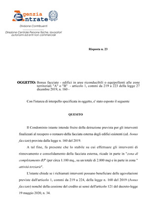 All’Agenzia è infatti pervenuto un interpello in cui l’istante chiarisce le caratteristiche dello stabile, che si trova in parte in “zona completamento B3” e in parte in “zona attività terziarie”, e chiede se oltre a poter accedere al bonus facciate ed eventualmente anche alla cessione del credito.